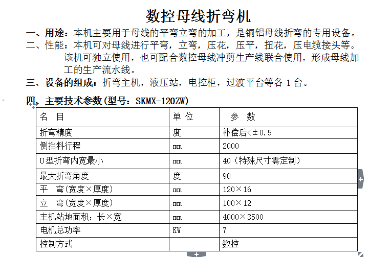 • 概述:???本機主要用于母線的平彎立彎的加工,是銅鋁母線折彎的專用設(shè)備,本機可對母線進行平彎,立彎,壓花,壓平,扭花,壓電纜接頭等。該機可獨立使用,也可配合數(shù)控母線沖剪生產(chǎn)線聯(lián)合使用,形成母線加工的生產(chǎn)流水線。