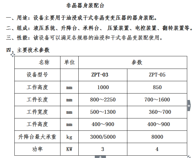 • 概述:???設備主要用于油浸或干式非晶變變壓器的器身裝配。設備運動機構采用液壓糸統,升降平穩,調節簡便,機器承重能力強、操作輕便、定位準確。