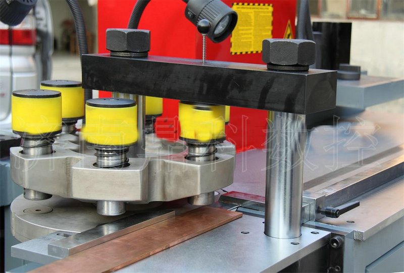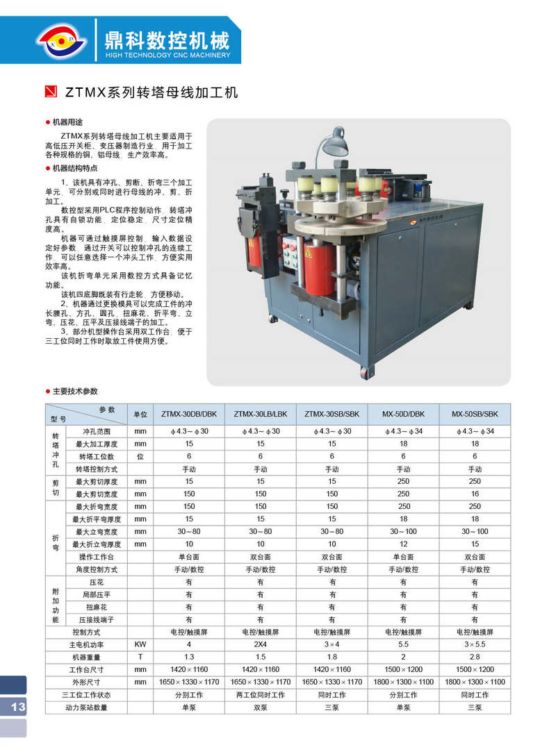 • 概述:???該機具有沖孔、剪斷、折彎三個加工單元,可分別或同時進行母線的沖、剪、折加工。機器通過更換模具可以完成工件的沖長腰孔、圓孔、扭麻花、折平彎、立彎、壓花、壓平、及壓接線端子的加工。