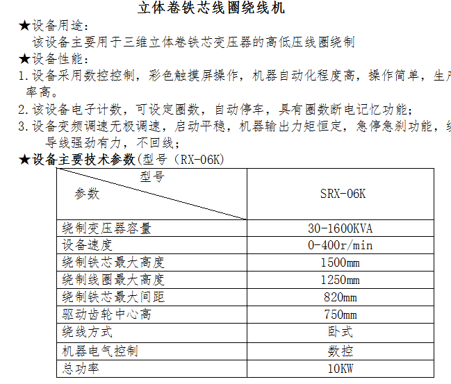 • 概述:???該設備主要用于三維立體卷鐵芯變壓器的高低壓線圈的繞制,設備采用數控控制,彩色觸摸屏操作,機器自動化程度高,操作簡單,生產效率高。該設備電子計數,可設定圈數,自動停車,具有圈數斷電記憶功能;設備變頻調速無極調速,啟動平穩,機器輸出力矩恒定,急停急剎功能,繞制導線強勁有力,不回線;